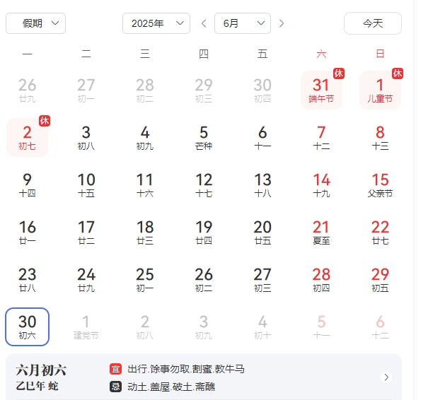 放假時間為 5 月 31 日(周六)至 6 月 2 日(周一),共計 3 天。6 月 2 日(星期一)為端午節(jié)法定節(jié)假日,5 月 31 日(星期六)、6 月 1 日(星期日)為正常公休日。